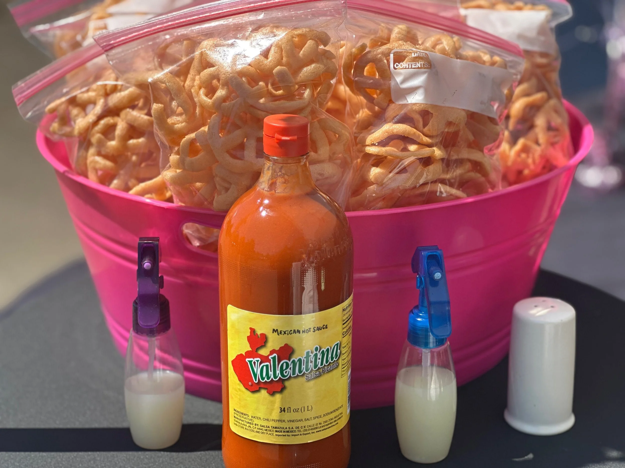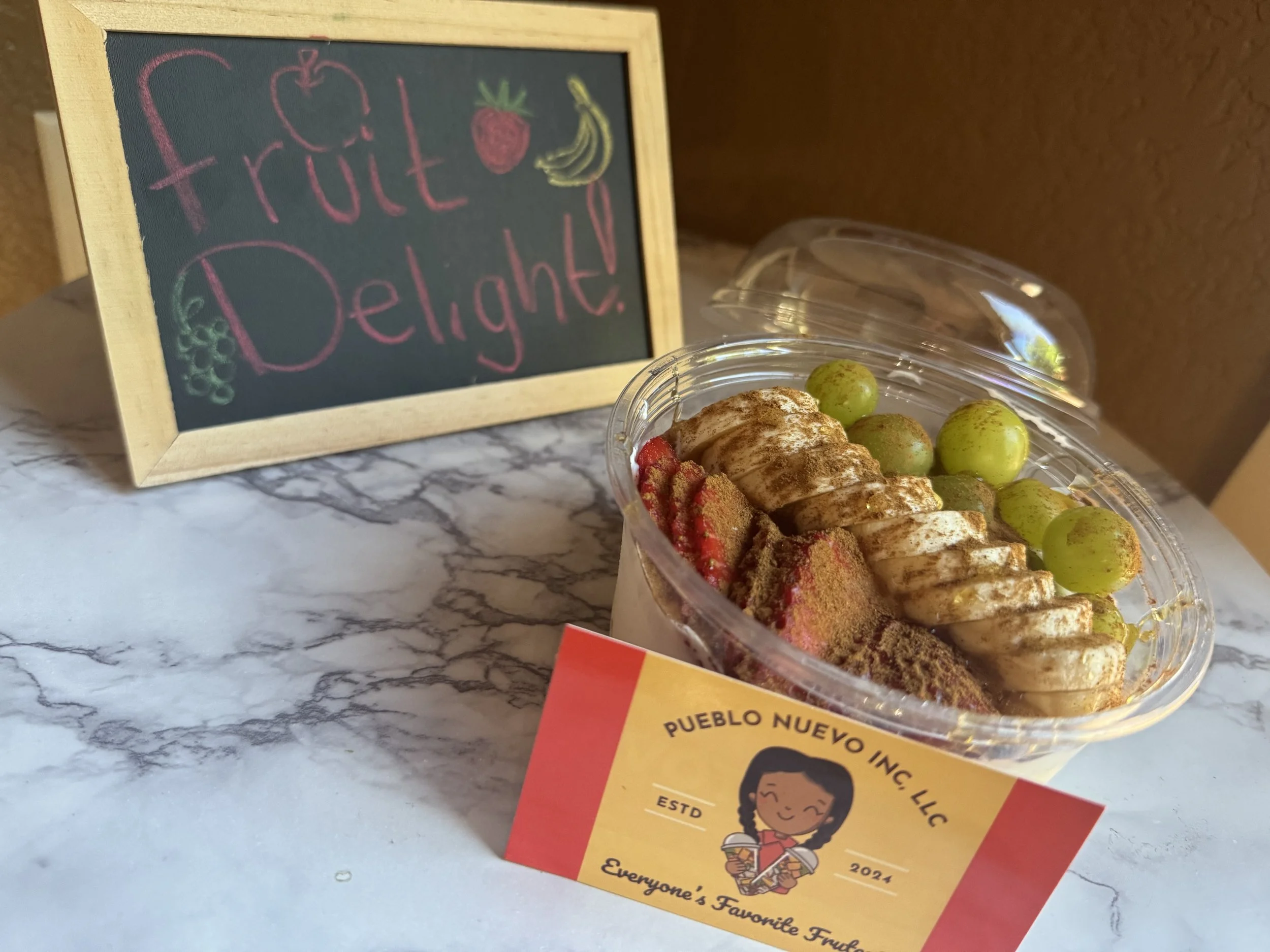 A vibrant medley of hand-cut seasonal fruit—cucumber, pineapple, watermelon, cantaloupe, mango, honeydew, and jicama—served fresh and crisp. Finished with a drizzle of our signature house-made chamoy and a touch of Tajín, or customized to your personal flavor preference. Tradition meets indulgence in every bite. Fruit cups come in 12oz or 24 oz cups.